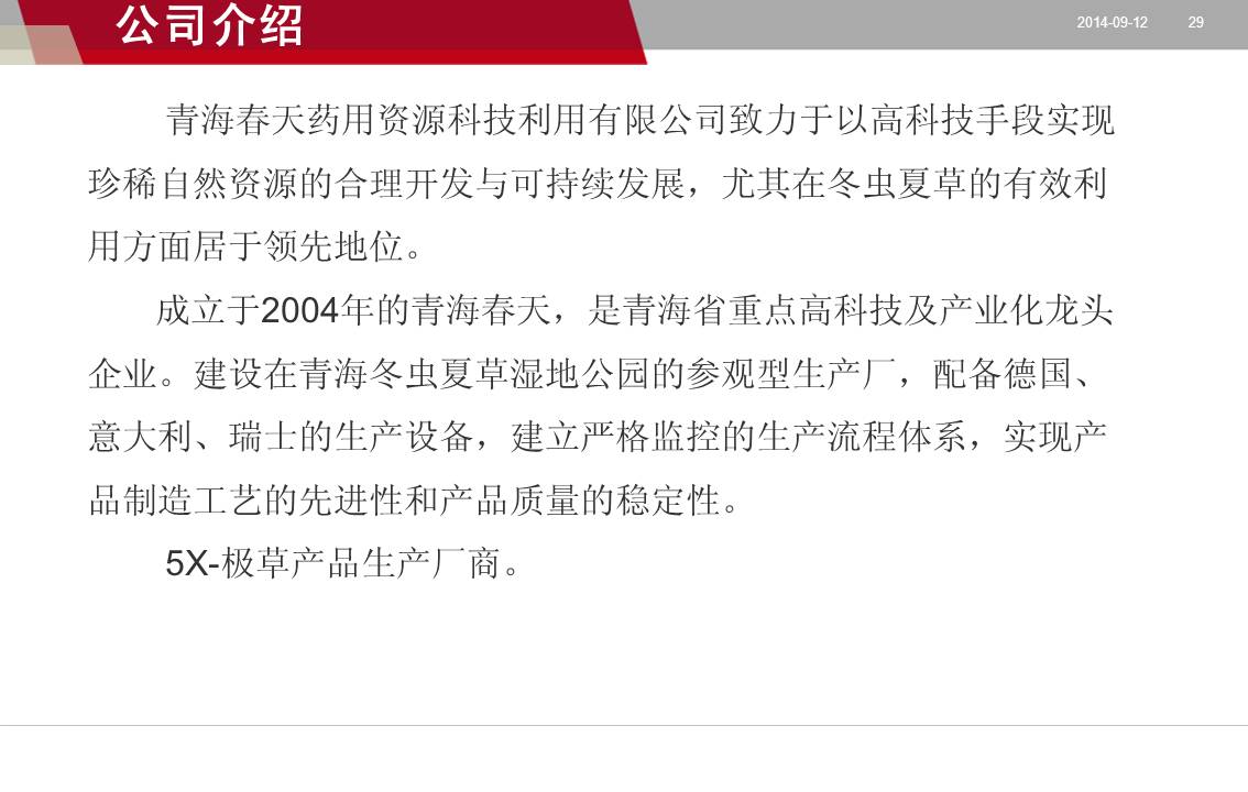 成立于2004年的青海春天,是青海省重點高科技及產(chǎn)業(yè)化龍頭企業(yè)。建設(shè)在青海冬蟲夏草濕地公園的參觀型生產(chǎn)廠,配備德國、意大利、瑞士的生產(chǎn)設(shè)備,建立嚴(yán)格監(jiān)控的生產(chǎn)流程體系,實現(xiàn)產(chǎn)品制造工藝的先進性和產(chǎn)品質(zhì)量的穩(wěn)定性。