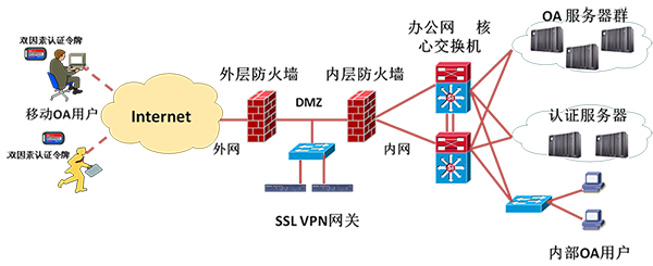 如圖所示,用戶辦公系統(tǒng)OA服務器與身份密碼認證服務器部署在企業(yè)核心內(nèi)網(wǎng),SSL VPN網(wǎng)關設備部署在防火墻區(qū)域。企業(yè)員工需要遠程辦公時,可以連接到Internet通過瀏覽器訪問SSL VPN網(wǎng)關,利用雙因素認證方式,內(nèi)網(wǎng)認證服務器會為企業(yè)員工提供動態(tài)的認證密碼,配合員工自己所設定的密碼組成一組完整的密碼來完成登陸企業(yè)內(nèi)網(wǎng)前的認證審核。安全、方便的實現(xiàn)遠程辦公需求。